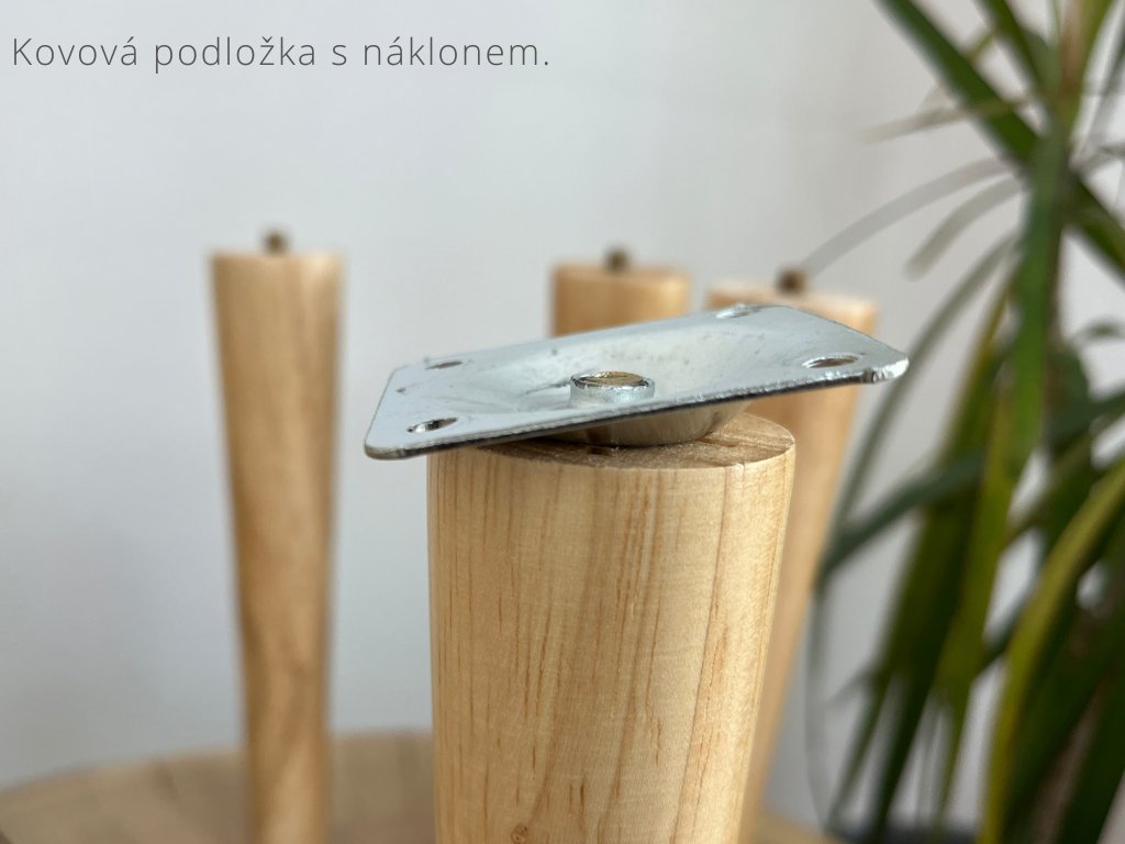Nohy jsou vyrobené z dřevěného přírodního dubového dřeva a mají tvar kužele. Ve spodní části je průměr dřeva 2,5 cm a v horní části 4 cm. Součástí balení jsou kovové podložky, které mají udělaný náklon, pokud by se vám líbila více rovná varianta, mrkněte do naší nabídky ZDE.