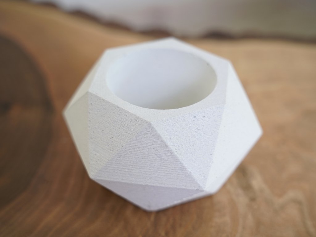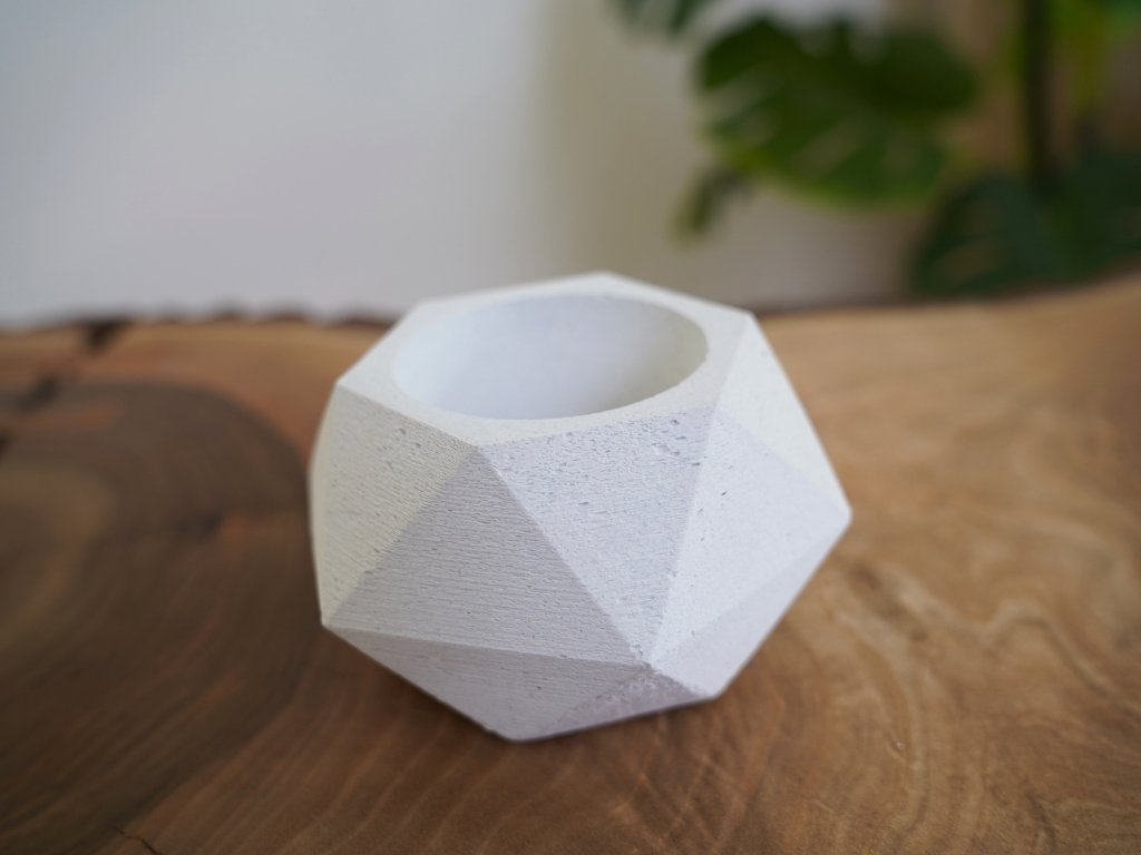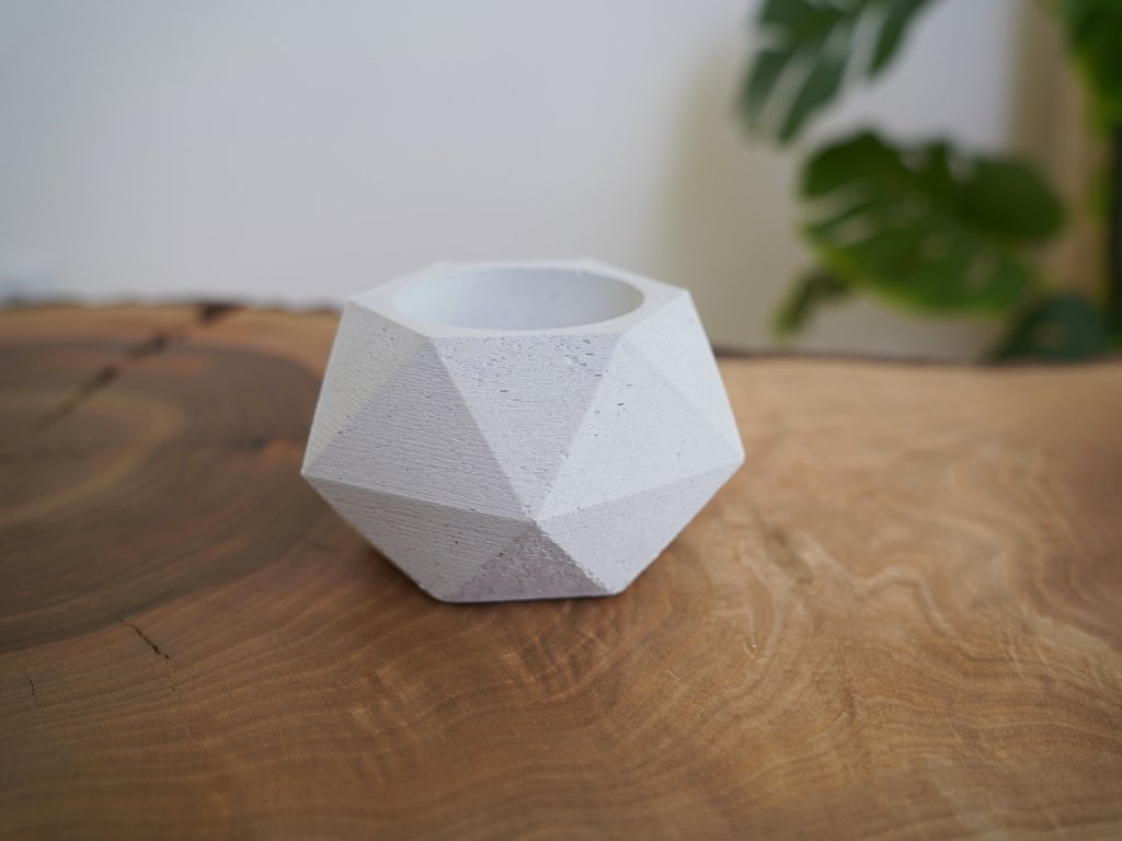 Geometrický betonový květináč na malý kaktus či jinou rostlinku krásně oživí vaši domácí zahrádku. Ať už ho zamícháte jako kontrastní prvek mezi jiné květináče nebo jej postavíte samotný doprostřed stolu, můžete si být jistí, že ho žádná návštěva nepřehlédne. Pokud nejste milovníci pokojových rostlin a květináč se vám přesto líbí, můžete jej klidně použít například jako svícen na čajovou svíčku.