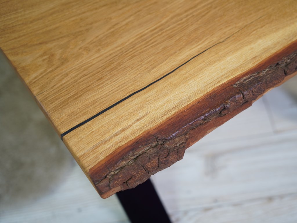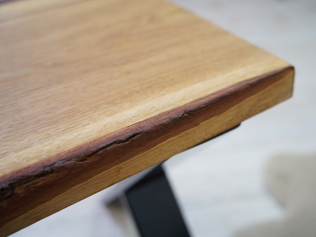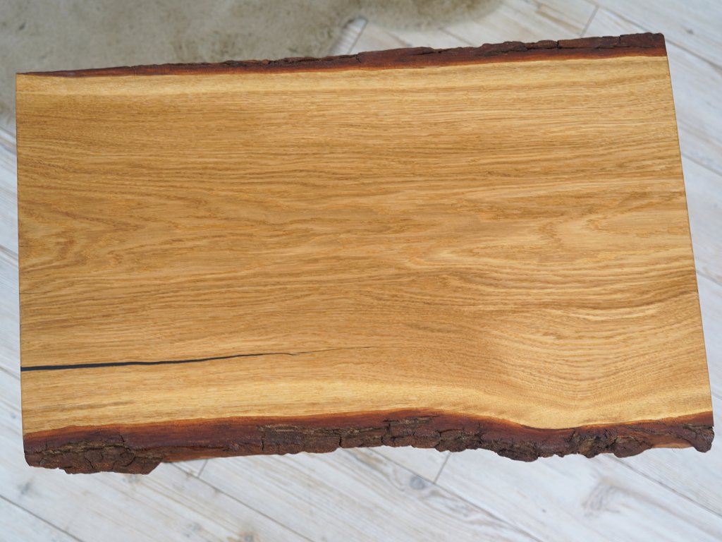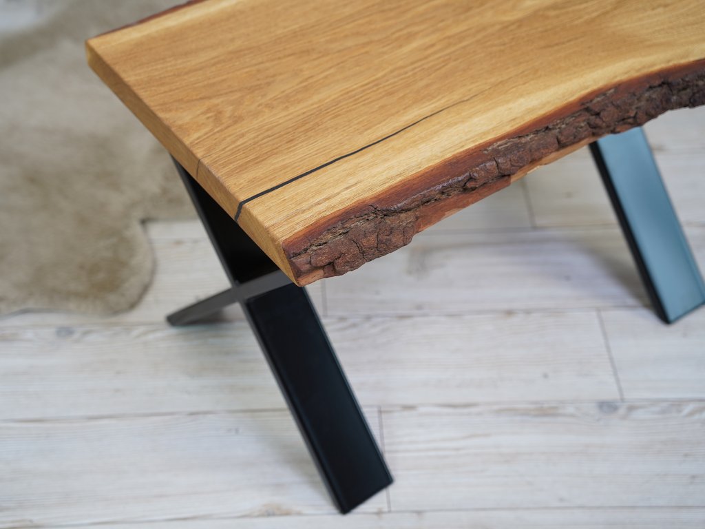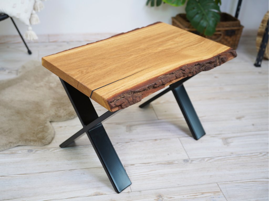 Dubový konferenčný stolík z prírodnej masívnej fošne 40-45x70 cm + Podnože do X