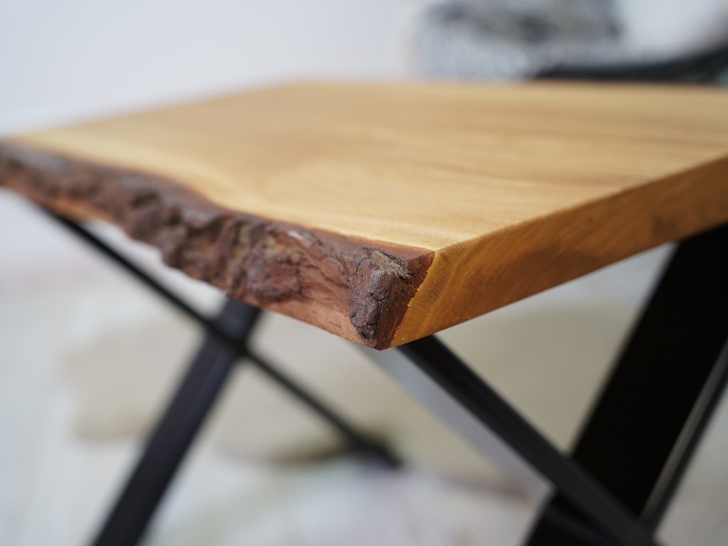 Masívnu dosku so silou 4 cm dopĺňajú úzke podnože do X, ktoré dodávajú celému stolíku masívny a nadčasový vzhľad.