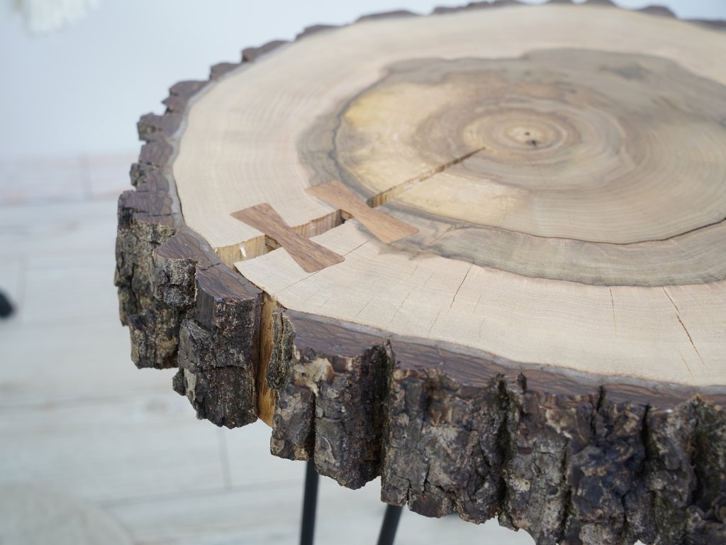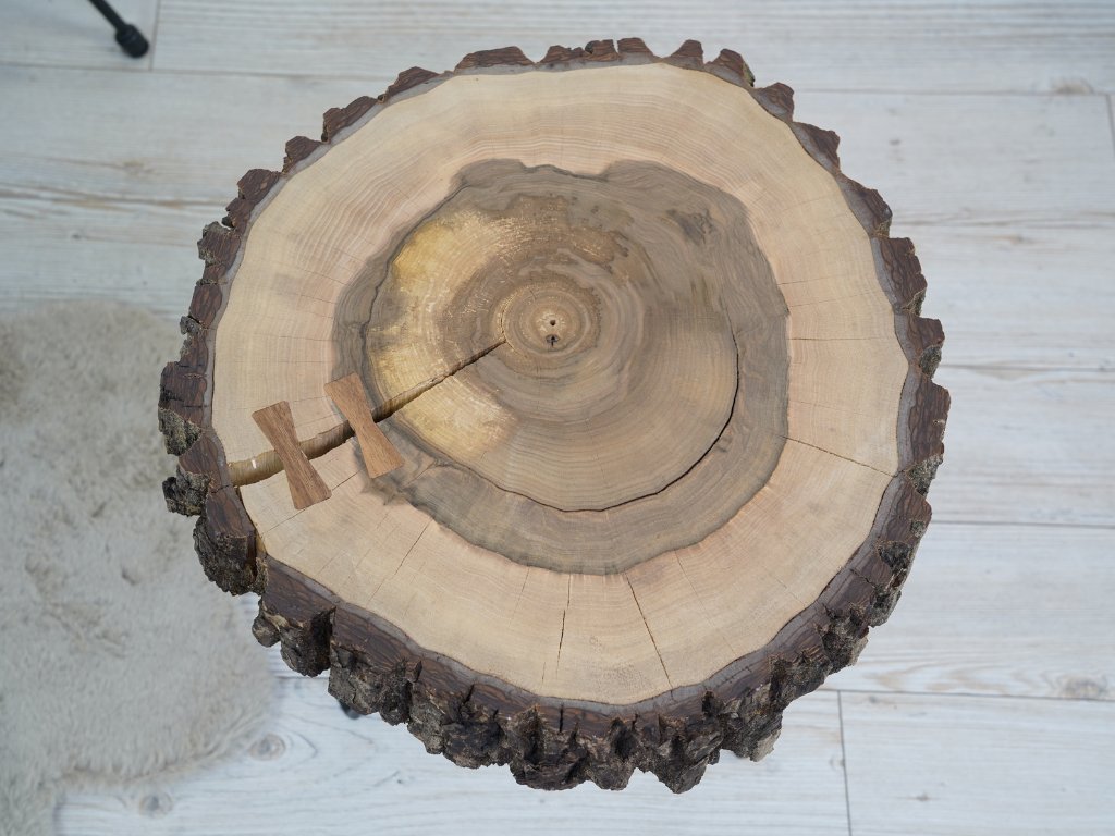 Konferenčný stolík je kompletne vyrobený v Českej republike z prírodného orechového dreva a má priemer cca 50 cm vo svojej najväčšej dĺžke. Okraje stolíka majú zachovalú kôru, pri ktorej bohužiaľ nedokážeme zaručiť 100% pevnosť, pretože sa jedná stále o prírodný produkt. Kôra je možné prípadne pripevniť či už klincom alebo prilepiť. Pokiaľ by ste s tým mali problémy, dajte nám vedieť a vždy všetko vyriešime k vašej spokojnosti. :)