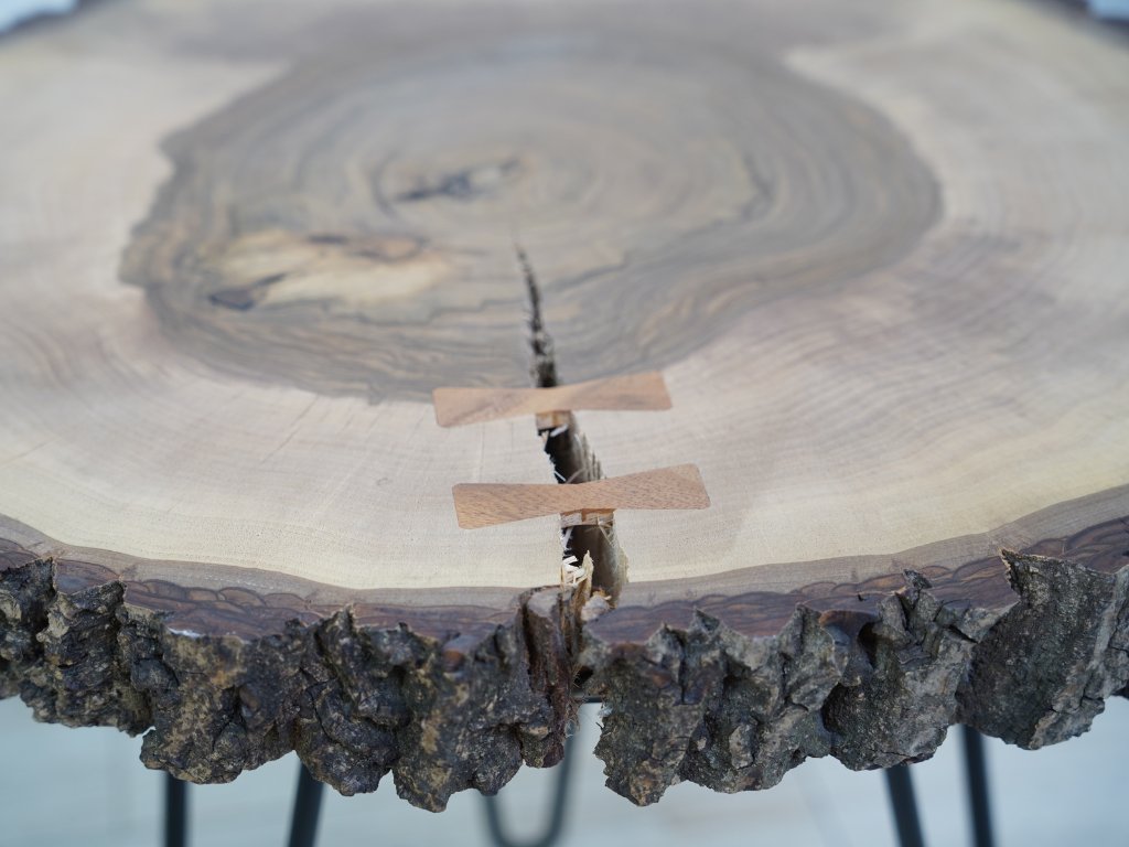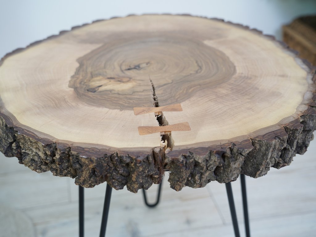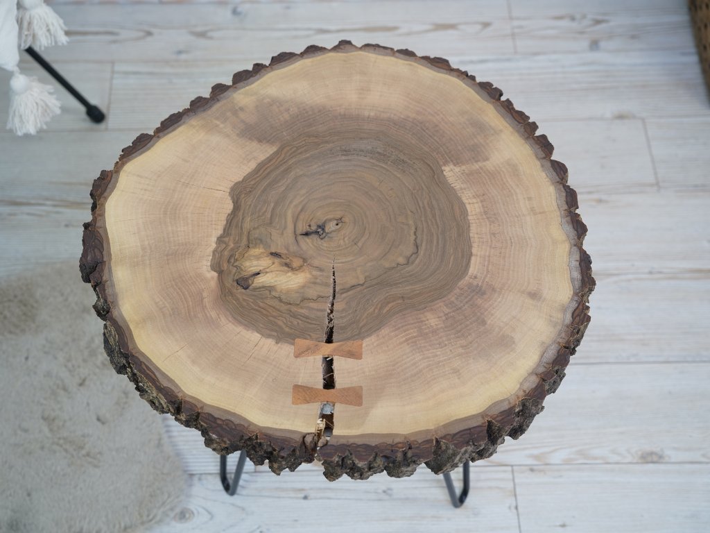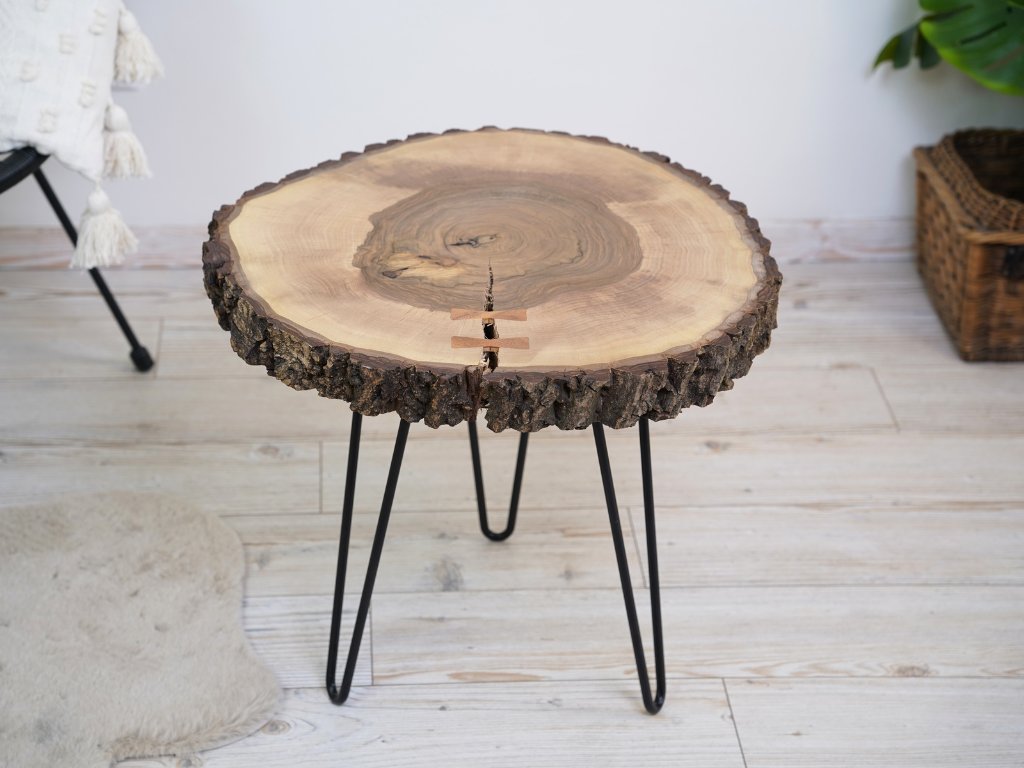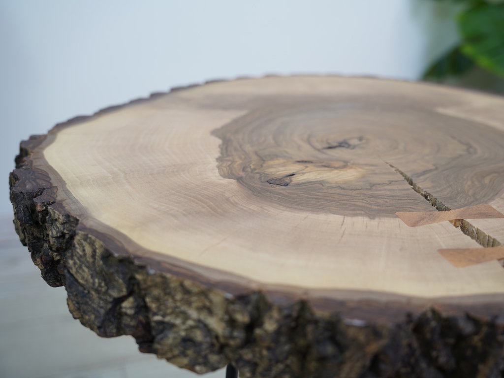 Konferenčný stolík je kompletne vyrobený v Českej republike z prírodného orechového dreva a má priemer cca 56 cm vo svojej najväčšej dĺžke. Okraje stolíka majú zachovalú kôru, pri ktorej bohužiaľ nedokážeme zaručiť 100% pevnosť, pretože sa jedná stále o prírodný produkt. Kôra je možné prípadne pripevniť či už klincom alebo prilepiť. Pokiaľ by ste s tým mali problémy, dajte nám vedieť a vždy všetko vyriešime k vašej spokojnosti. :)