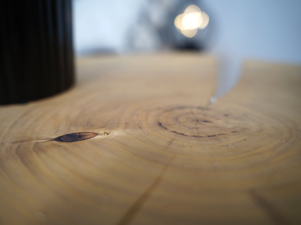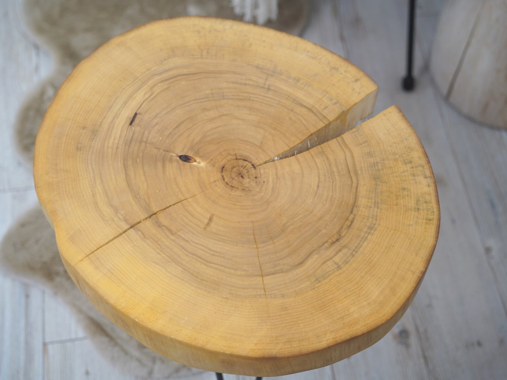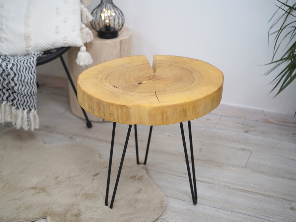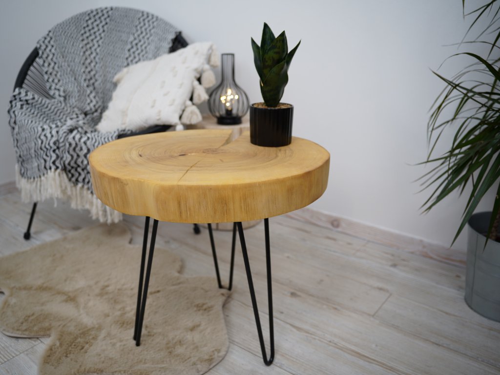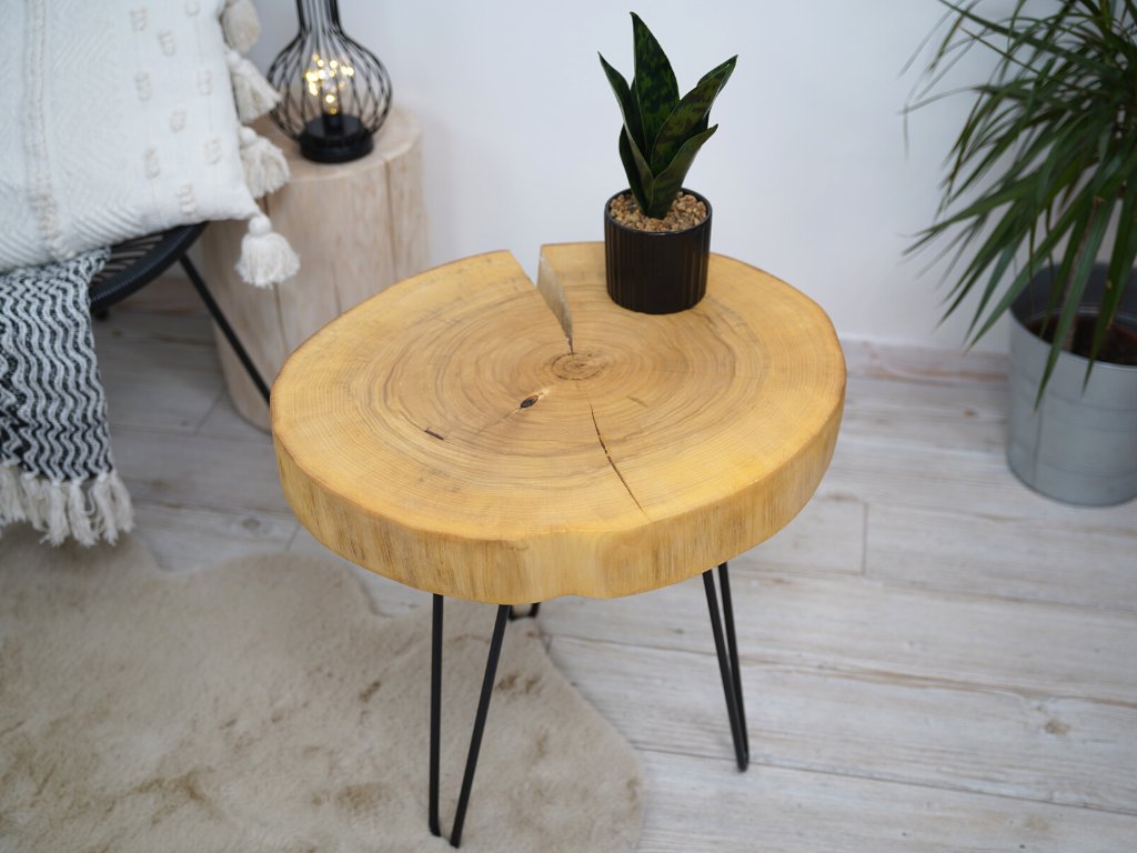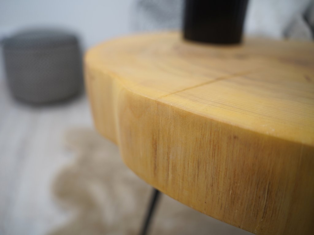 Konferenčný stolík je kompletne vyrobený v Českej republike z prírodného topoľového dreva a má priemer 53 cm vo svojej najväčšej dĺžke. Topoľ má elegantnú prasklinu smerujúcu k stredovým letokruhom. O finálnu úpravu dreva sa postaral špeciálny olej Rubio Monocoat, ktorý nielen dodá drevu krásny vzhľad a pocit jemnosti, ale navyše je veľmi odolný voči oderu a vode a je ekologický.